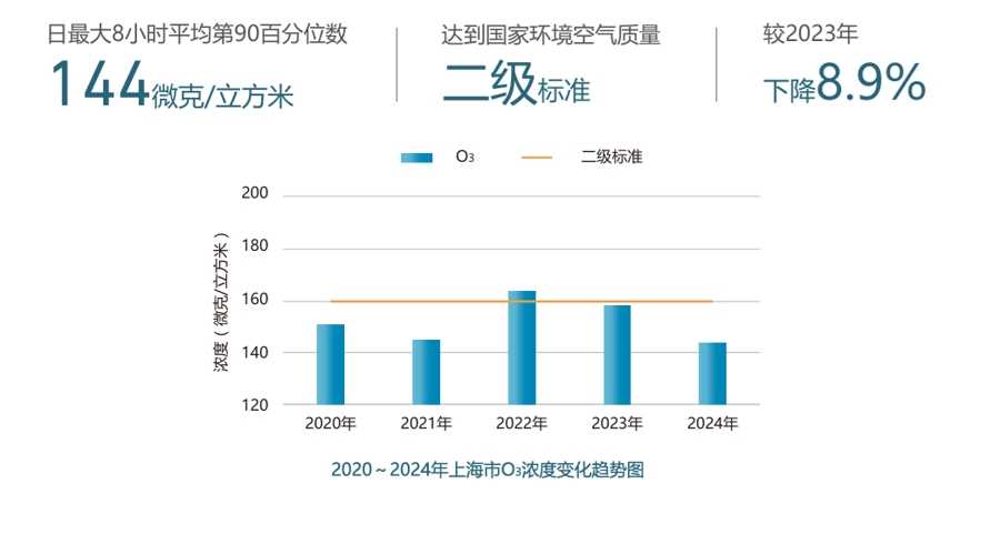 臭氧治理虽难,但2024年的监测数据释放了积极信号。在2022年升至近五年最高位(164微克/立方米)后,2024年上海臭氧日最大8小时平均第90百分位数降至了近五年的最低位。