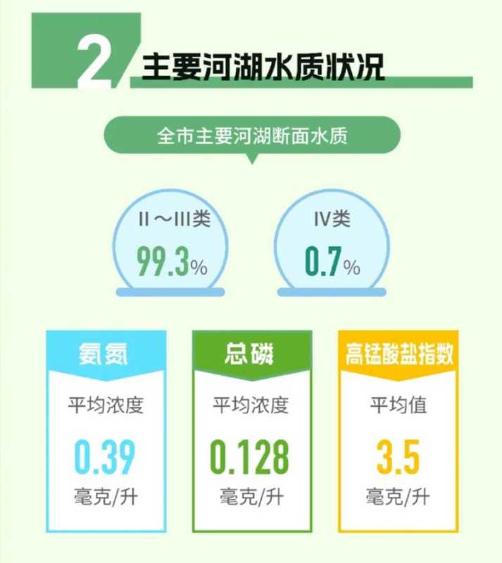 上海多个水环境主要污染物的浓度也越来越低。2024年,参与评价的主要河湖断面总磷平均浓度为0.128毫克/升,较2023年下降2.3%;高锰酸盐指数平均值为3.5毫克/升,较2023年下降2.8%。然而,值得注意的是,2024年参与评价的主要河湖断面的氨氮平均浓度比2023年上升了2.6%,这提醒治理者需更加关注生活、农业面源的污水排放问题。