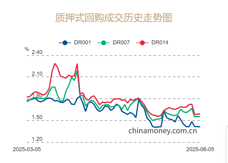 数据显示,6月6日银行间市场加权DR007为1.5323%,较上日下调1.86个基点。当前DR007已持续低于5月8日央行降息当日货币市场DR007水平。