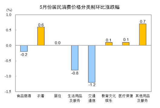 工业生产者价格环比变动方面,5月份生产资料价格下降0.6%,生活资料价格持平。