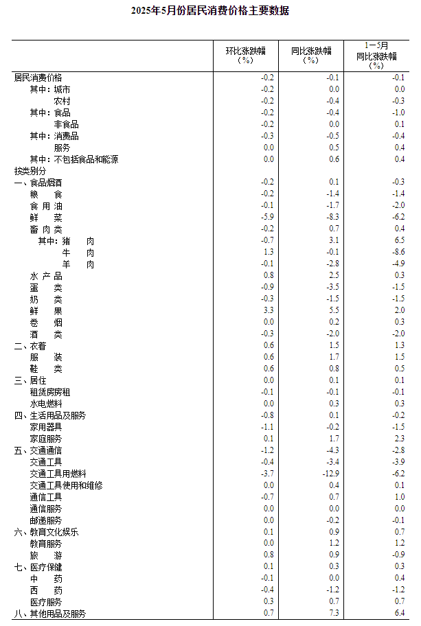 2025年5月份居民消费价格同比下降0.1%,CPI变动引关注