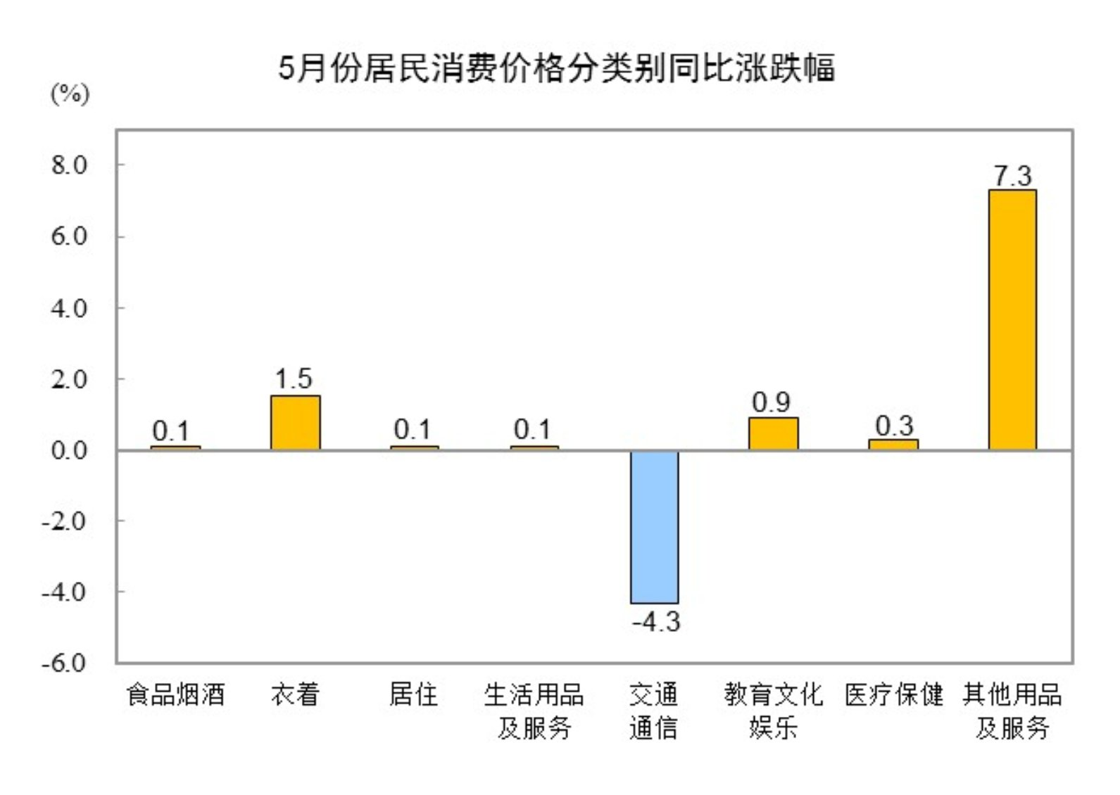 5月份,全国居民消费价格同比下降0.1%,工业生产者出厂价格指数环比下降0.4%,同比下降3.3%。虽然整体价格下降,但部分领域如高端装备制造等价格同比上涨,显示出经济在调整中逐步企稳。