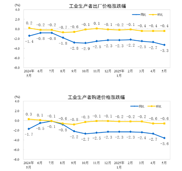 此外,2025年5月份工业生产者出厂价格同比下降3.3%,环比下降0.4%;工业生产者购进价格同比下降3.6%,环比下降0.6%。其中,生产资料价格下降显著,影响工业生产者出厂价格总水平。