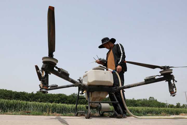2025年5月7日,河南省焦作市温县祥云镇古贤村,村民为植保无人机添加药液开展“一喷三防”。在河北邯郸市邱县,收割机此起彼伏的轰鸣声中,大片冬小麦加快收获进度。据邯郸市农业农村部门估产,今年该市夏粮将实现增产。