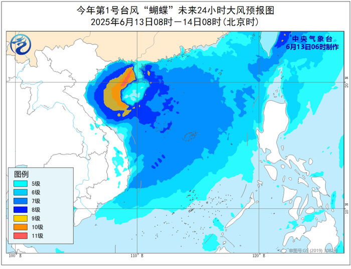 中央气象台6月13日06时继续发布台风黄色预警。今年第1号台风“蝴蝶”(热带风暴级)于12日晚加强为强热带风暴级,13日早晨5点其中心位于海南省乐东县南偏东方向约35公里海面,中心附近最大风力达10级,预计将于今天上午在海南省乐东县到东方市附近沿海登陆,也有可能沿海南岛西部近海北上,14日中午在广东徐闻到广西北海再次登陆,登陆后强度逐渐减弱。