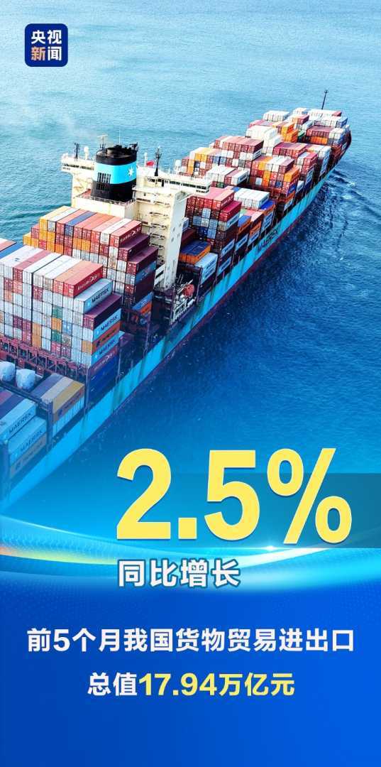 海关总署6月9日公布,今年前5个月,我国货物贸易进出口总值17.94万亿元,同比增长2.5%,延续增长态势。其中,对东盟、欧盟出口增长显著,彰显外贸韧性。外贸作为经济的重要指标,其稳健增长预示着中国经济活力。