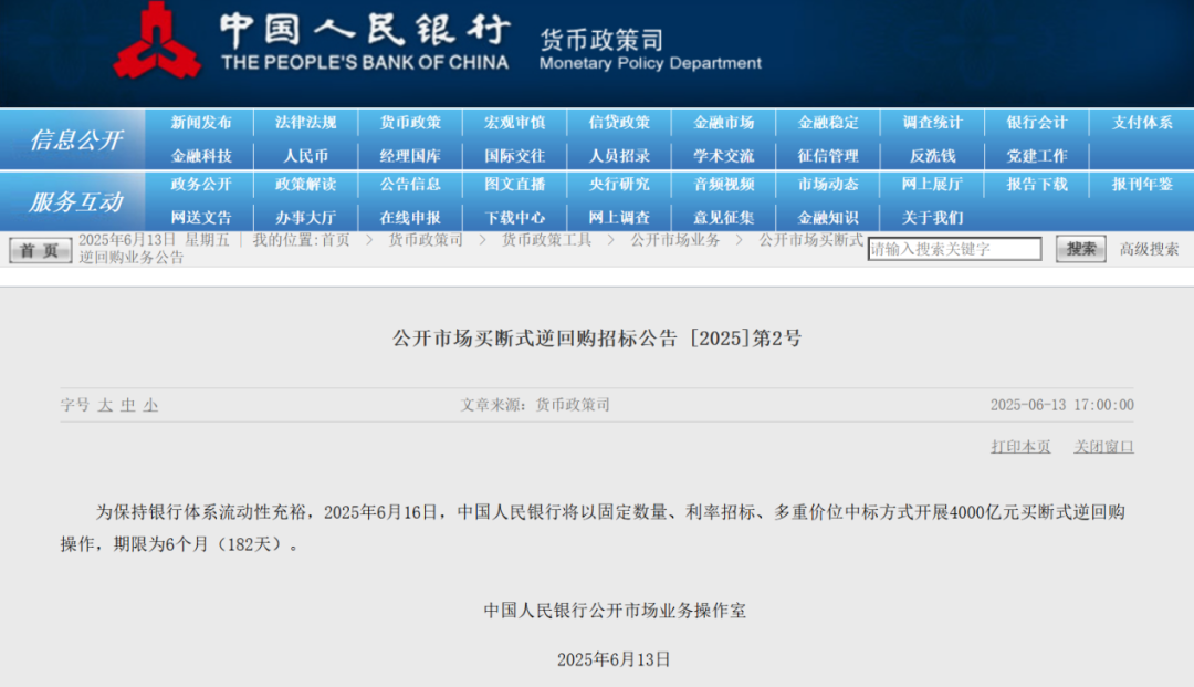 此外,6月13日,央行公告称,将于6月16日开展4000亿元买断式逆回购操作,期限为6个月,旨在增强市场流动性。