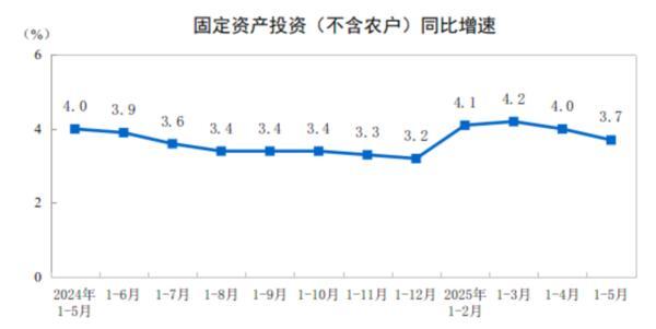 2025年1—5月份,全国固定资产投资(不含农户)同比增长3.7%,民间固定资产投资同比持平。第二产业投资增长11.4%,第三产业投资略有下降。地区差异和登记注册类型投资表现各异。