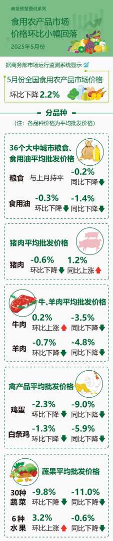 5月份全国食用农产品市场价格环比下降2.2%,主要品种如粮食、食用油、猪肉等价格均有所下降,为消费者提供了更多实惠。同时,牛肉、羊肉、鸡蛋等价格也有所回落,而水果价格略有上涨。