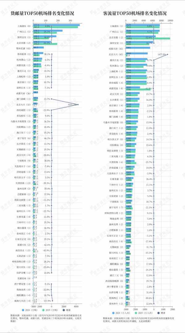 从数据来看,航空运输整体仍处于上行阶段。客运方面,2019年至2024年增长了约8%;货运方面,增长17.32%,涨势好于客运。具体到机场,客流量TOP 50中,36家机场客流上涨。货邮量TOP 50机场中,除新建机场外,多地机场上涨50%以上。