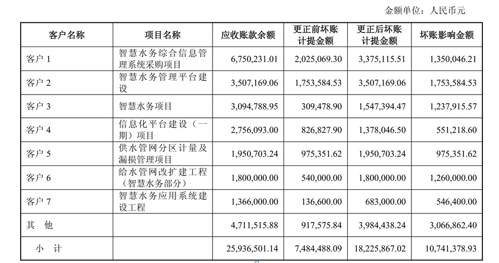 记者注意到,据和达科技的回复公告,智慧水务项目是其坏账准备更正的“重灾区”。和达科技回复公告显示,此次更正前后,坏账影响金额约1074万元。在统计表格中,和达科技列举了7名客户,其中5名与智慧水务有关,这5名客户的合计坏账影响金额约615万元。例如,对于客户2的“智慧水务管理平台建设”项目,应收账款余额约351万元,更正前坏账计提金额约175万元,更正后坏账计提金额约350万元,由此产生坏账影响金额约175万元。和达科技称,其客户2中标湖南省湘水水务有限公司项目(以下简称“湘水项目”),2020年客户2就湘水项目的合同内容“智慧水务管理平台建设”招标,和达科技中标并签署合同约1349万元。和达科技称,其与客户2的上述项目于2021年验收,截至去年底回款约796万元,约为验收金额的69.43%。“公司是分包单位,智慧水务项目验收后,公司多次催款及协商,因业主方资金困难,回款难度高,收款周期长,且合同约定工程审计后支付到审计价的97.5%。”和达科技表示,基于谨慎性原则,根据项目收款风险将对客户2的应收账款余额的计提比例由50%提高至100%。