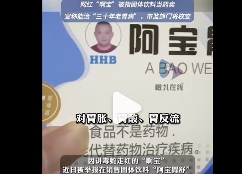 6月18日,据澎湃新闻,有湖北的消费者日前向澎湃公众互动平台“服务湃”反映,最近因讲蛇咬伤救治而走红网络的“啊宝”从2024年开始,就在微信上兜售一款名为“阿宝胃舒”的“固体饮料”,却宣称这是“胃药”,可以根治胃酸胃胀等多种胃部不适,还能治疗痛风、关节炎,售价不菲。