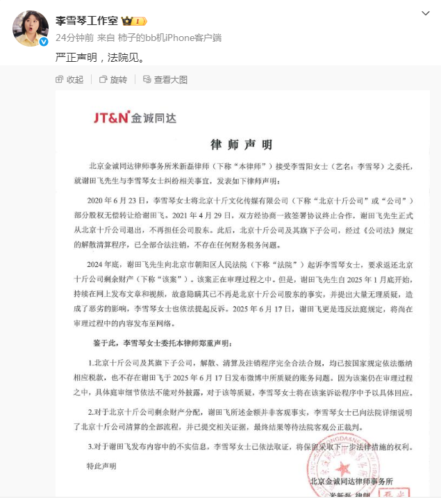每经AI快讯,6月18日,李雪琴工作室发布最新声明。声明中明确提到:北京十斤公司及其旗下子公司,解散、清算及注销程序完全合法合规,已按国家规定依法缴纳相应税款,并不存在谢田飞于2025年6月17日微博中所质疑的账务问题。此外,针对谢田飞发布内容中的不实信息,李雪琴女士已依法取证,并将保留采取下一步法律措施的权利。此前,6月17日,网友@老谢同学之你谢哥发布微博,自称“曾是李雪琴公司(北京十斤文化传媒有限公司)的股东”,并实名举报该公司存在财务问题。