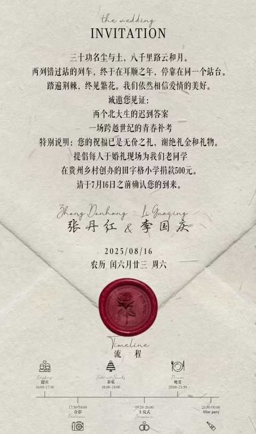 网传请柬内容显示:三十功名尘与土,八千里路云和月。两列错过站的列车,终于在耳顺之年,停靠在同一个站台。踏遍荆棘,终见繁花。我们依然相信爱情的美好。诚邀您见证:两个北大生的迟到答案,一场跨越世纪的青春补考。特别说明:您的祝福已是无价之礼,谢绝礼金和礼物。提倡每人于婚礼现场为我们老同学在贵州乡村创办的田字格小学捐款500元。请于7月16日之前确认您的到来。