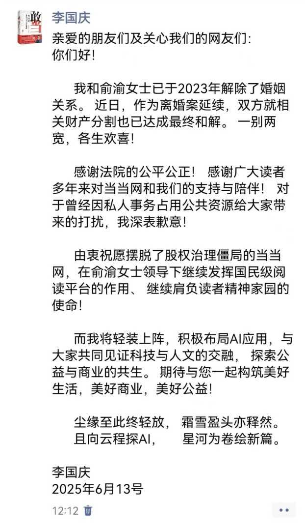 红星资本局注意到,就在5天前,6月13日,当当网创始人、早晚读书董事长李国庆在朋友圈发文称,“我和俞渝女士已于2023年解除了婚姻关系。近日,作为离婚案延续,双方就相关财产分割也已达成最终和解。”