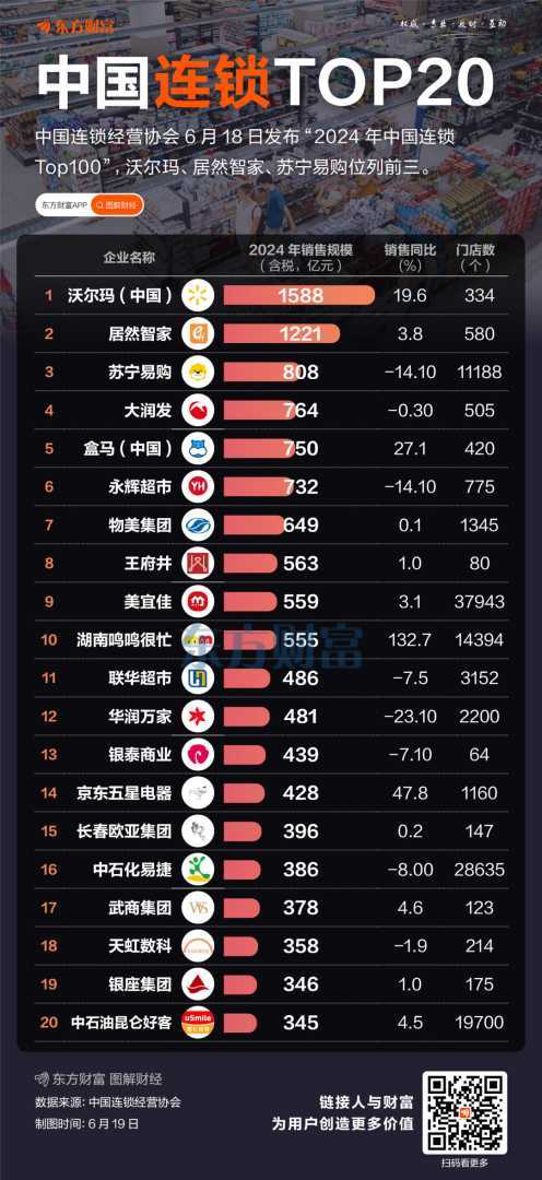 6月18日,中国连锁经营协会发布2024年中国连锁Top100,销售规模达2.13万亿元,门店总数25.72万个。沃尔玛居首,美宜佳蝉联便利店之王,行业增长态势良好。