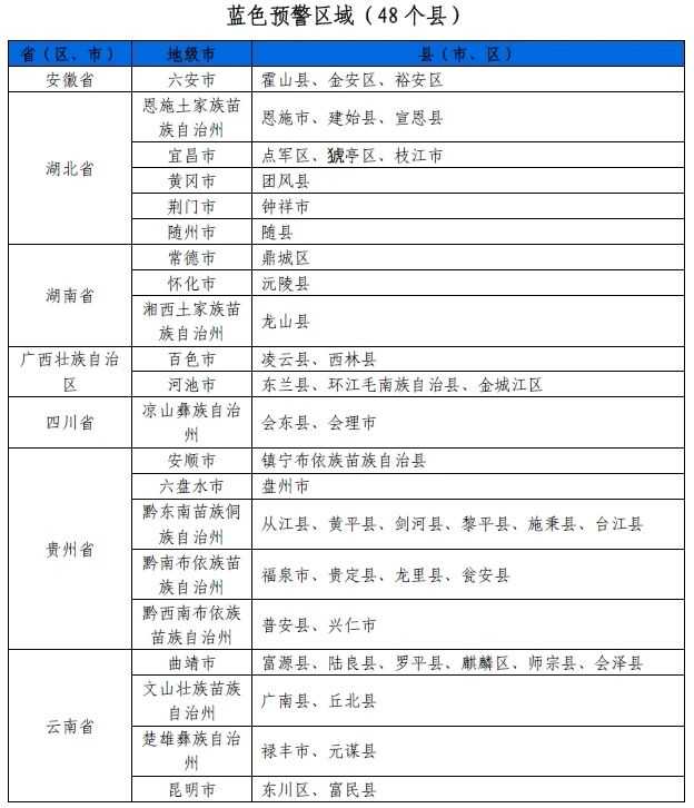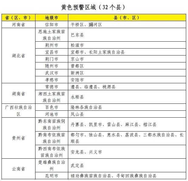 新华财经北京6月19日电水利部和中国气象局6月19日18时联合发布红色山洪灾害气象预警:预计,6月19日20时至6月20日20时,安徽西部、河南南部、湖北东部和西南部、湖南北部、广西西北部、贵州南部等地部分地区发生山洪灾害可能性大(橙色预警),局地发生山洪灾害可能性很大(红色预警),预警区域涉及的县(市、区)见下表。其他地区也可能因局地短历时强降水引发山洪灾害,请各地注意做好实时监测、防汛预警和转移避险等防范工作,以应对可能发生的山洪灾害。