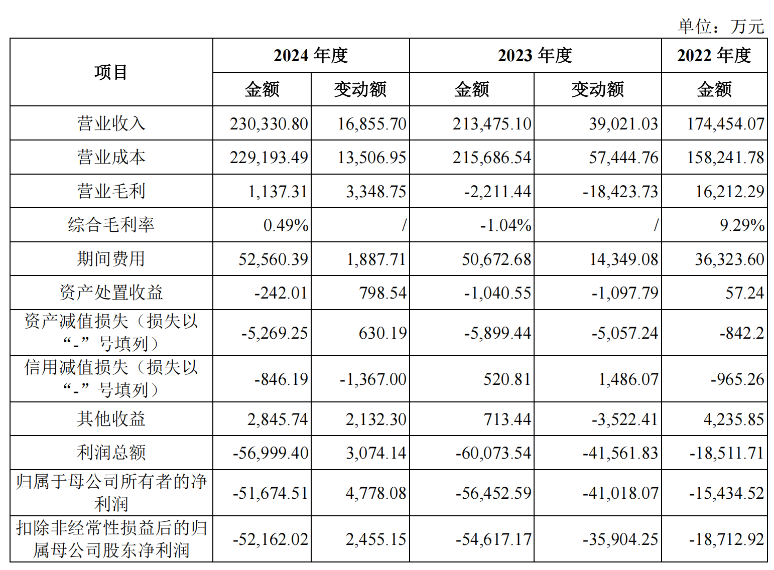 2022年~2024年,公司综合毛利率分别为9.29%、-1.04%、0.49%,公司主营业务毛利率分别为9.30%、-1.06%、0.47%,整体下降且处于较低水平。公司新能源汽车零部件毛利率分别为10.07%、-5.49%、-6.20%。
