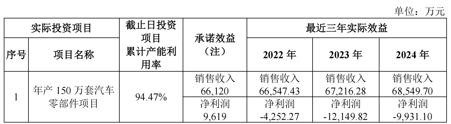 另外,公司公开发行可转换公司债券募集资金投向“高端汽车零部件智能制造项目(一期)”,上述募投项目自2023年末达到预定可使用状态,2024年度实现销售收入5.19亿元,实现利润总额-1.65亿元,分别占承诺效益的比例为46.36%及-118.81%,效益不及预期。