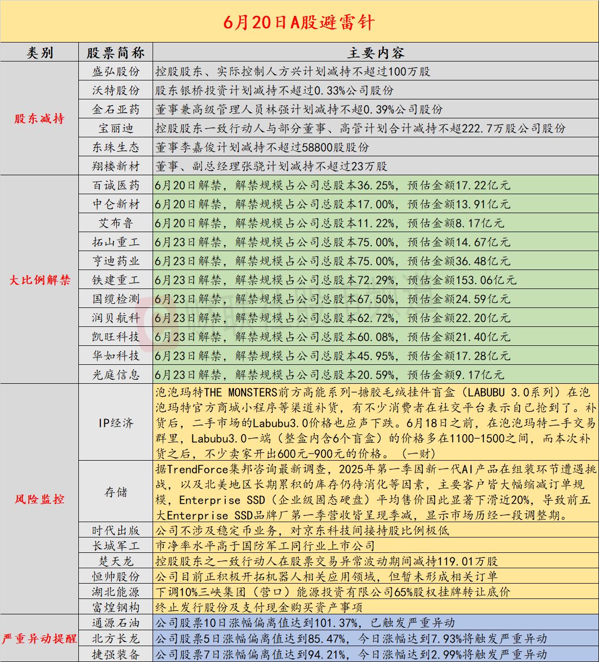 财联社6月20日投资避雷针,A股及海外市场风险事件频发。Labubu补货后二手报价腰斩,大湾区新房经理指数下滑。特朗普或两周内决定是否攻击伊朗,全球外国直接投资连续下降,Enterprise SSD市场也面临调整。