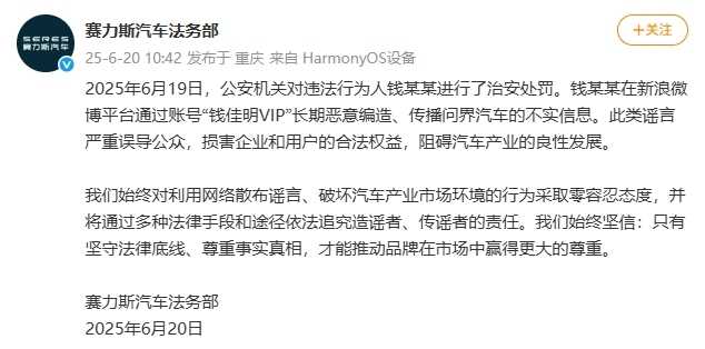 6月20日,赛力斯汽车法务部发文称,公安机关已对编造、传播问界汽车不实信息的钱某某进行治安处罚。此类谣言损害企业和用户权益,阻碍汽车产业良性发展。