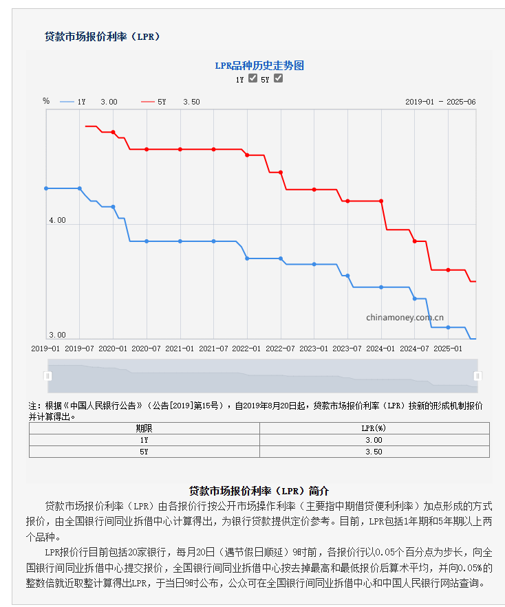 5月份下调之后,6月份LPR保持不变,这一政策动态引发市场广泛关注。6月20日,中国人民银行授权全国银行间同业拆借中心公布,2025年6月20日贷款市场报价利率(LPR)为:1年期LPR稳定在3.0%(与上次持平),5年期以上LPR同样维持在3.5%(与上次一致)。以上LPR在下一次发布LPR之前将持续有效,为市场提供了稳定的利率预期。