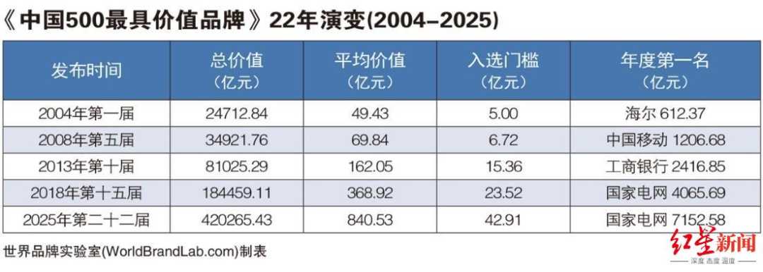 据了解,世界品牌实验室编制中国品牌报告已走过第22个年头。2004年入选门槛仅为5亿元,前500名品牌的平均价值为49.43亿元。2025年,入选门槛已经提高到42.91亿元,而前500名品牌的平均价值高达840.53亿元,增幅为1600.45%。这一数据不仅反映了中国品牌价值的飞速提升,也预示着未来中国品牌在全球市场上的巨大潜力。