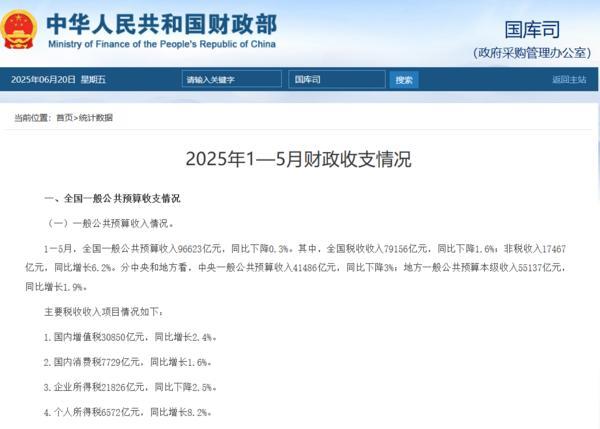 中国网财经6月20日讯财政部网站发布2025年1—5月财政收支情况。数据显示,1—5月,全国一般公共预算收入96623亿元,同比下降0.3%。全国一般公共预算支出112953亿元,同比增长4.2%。