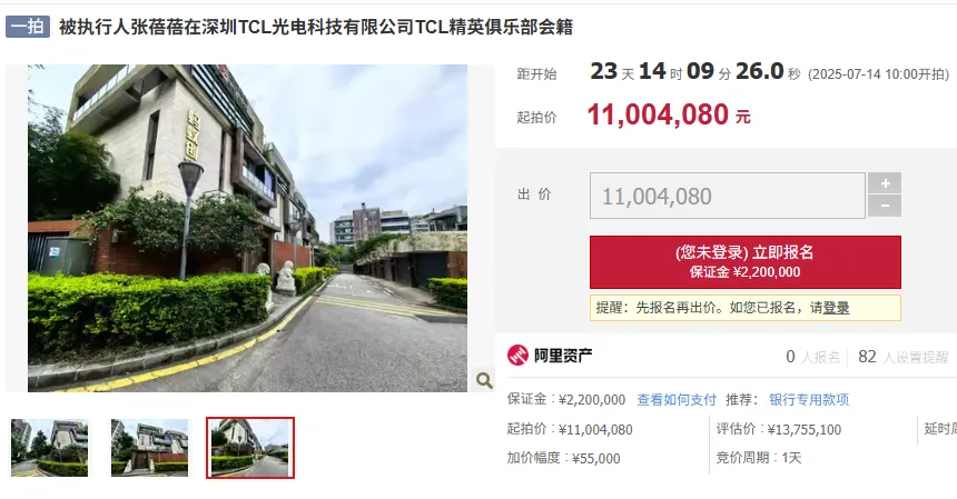 阿里拍卖平台显示,深圳TCL精英俱乐部会籍将于7月14日拍卖,起拍价1100万元,含南山区一处房产使用权,评估价1375.51万元,因借款合同纠纷被强制执行。