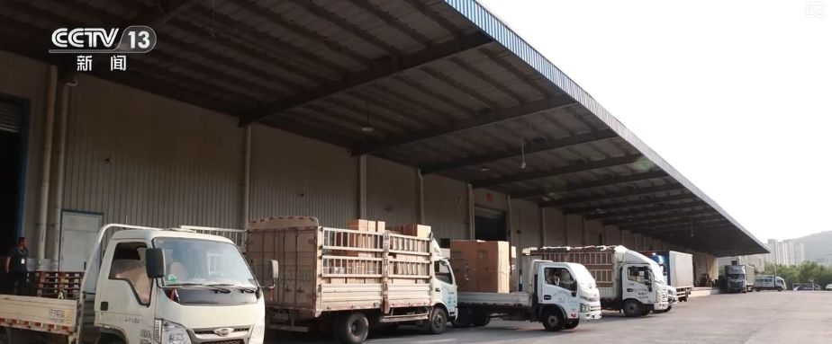 山东济南家电物流中心仓负责97个县域配送,作业高峰时,十几辆物流车排成一列等待装货。