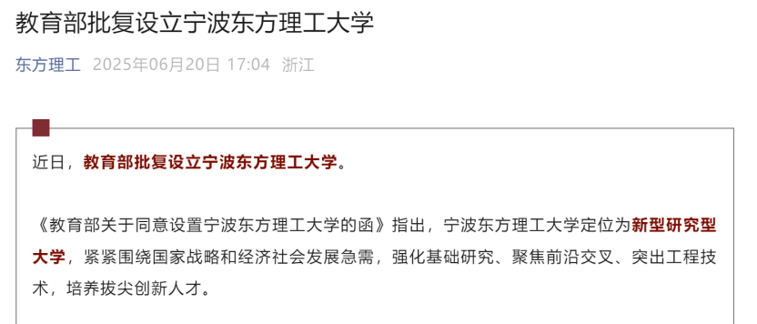 6月20日,宁波东方理工大学官方公众号发文表示,近日教育部批复设立宁波东方理工大学。据了解,该学校由宁波市虞仁荣教育基金会创办,由省市重点建设、国家重点支持,是探索高起点、小而精、国际化新型研究型大学的积极尝试。