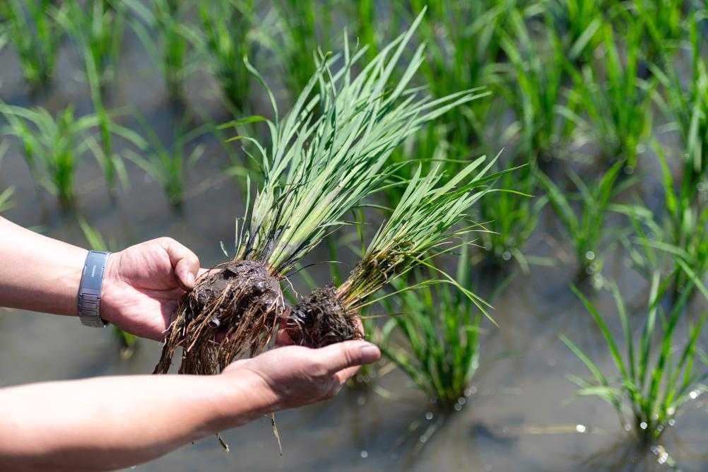 6月18日,中国水稻研究所北方水稻研究中心科研人员查看应用寒地水稻秸秆全量原位还田缓释多效综合技术的水稻(左)与普通水稻的长势差别。新华社记者谢剑飞摄