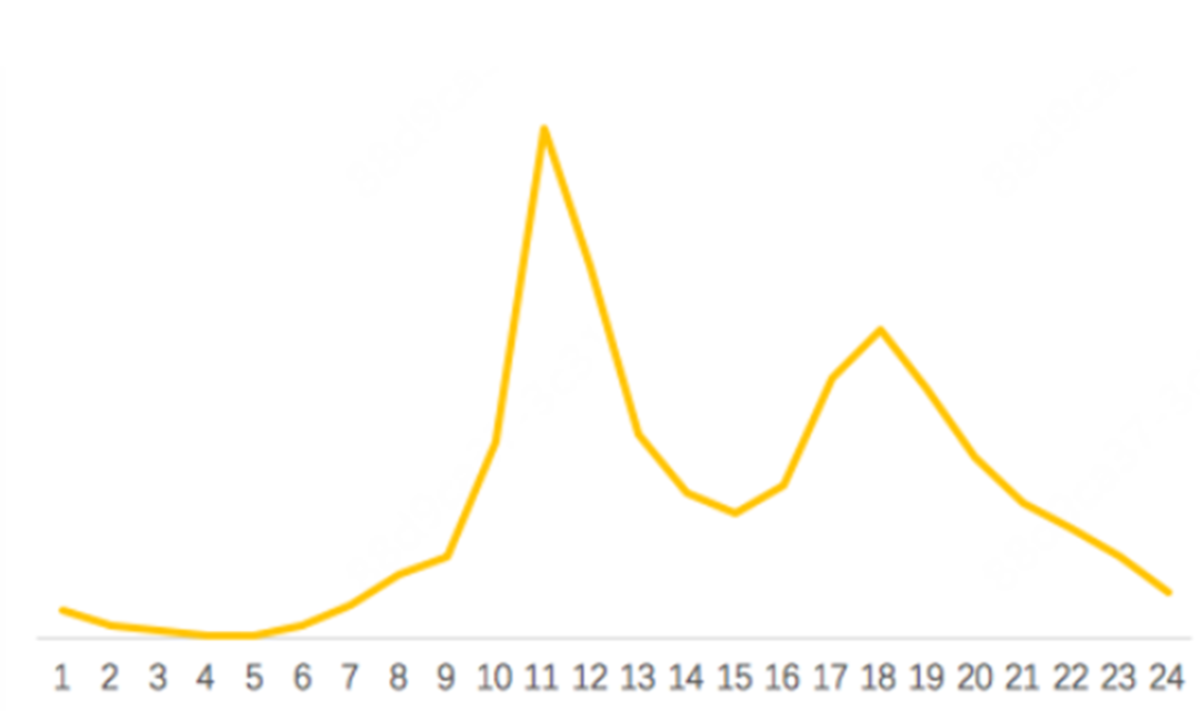 外卖订单下单时段分布显示,骑手在高峰期能获得较高收入。(来源:《中国外卖产业调查研究报告(2019年前三季度)》)