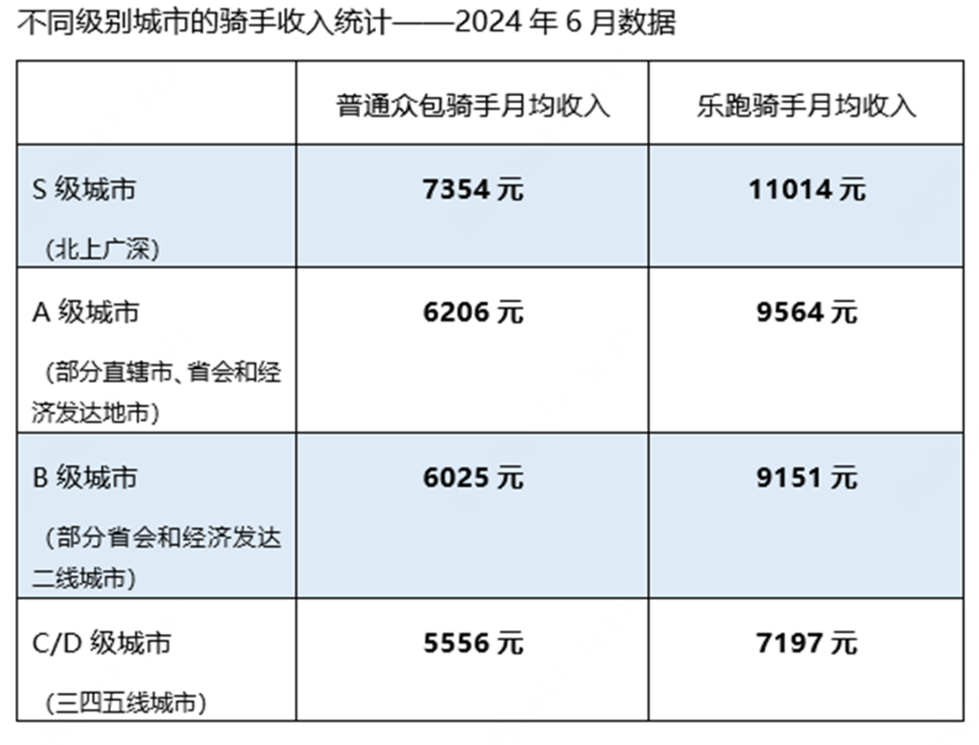数据显示,若骑手全年跑单超过260天,日均接单时长在6小时以上,其收入在当地将颇具竞争力。以2024年6月为例,一线城市骑手月收入可达7354元以上,三线及以下城市骑手月收入则可达5556元以上。
