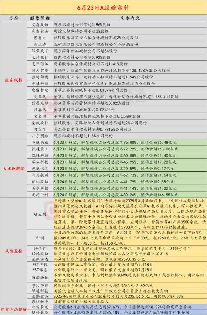 导读:财联社6月23日投资避雷针,揭示A股及海外市场潜在风险。国内经济数据显示,1—5月全国一般公共预算收入同比下降0.3%,网信办整治AI滥用,处置3500余款违规AI产品。公司方面,任子行股票被实施风险警示,诺德股份铜箔业务在固态电池领域收入占比不足1%。海外市场方面,美股涨跌不一,谷歌大跌,特朗普称美军轰炸伊朗核设施,伊朗或关闭霍尔木兹海峡,欧盟对中企采取歧视性措施,美联储官员称无紧迫理由降息。