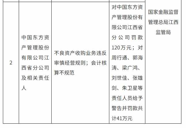 国家金融监督管理总局江西监管局对中国东方资产管理江西省分公司开出罚单,因其不良资产收购业务违规及会计核算不规范,罚款120万元,相关责任人亦被警告并罚款。