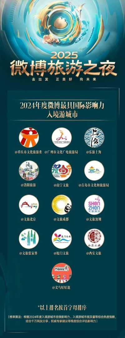 “2025微博旅游之夜”是微博全年重磅活动之一,活动发布了2024年度微博最受关注国内景区、最具影响力国内游城市、最具影响力国内目的地、文旅创新传播博物馆等。最具影响力国内游城市包括大理、大同、贵阳、哈尔滨、洛阳、太原、成都、武汉、烟台、福州、重庆、天水。成都作为热门旅游城市,其文旅影响力持续扩大。