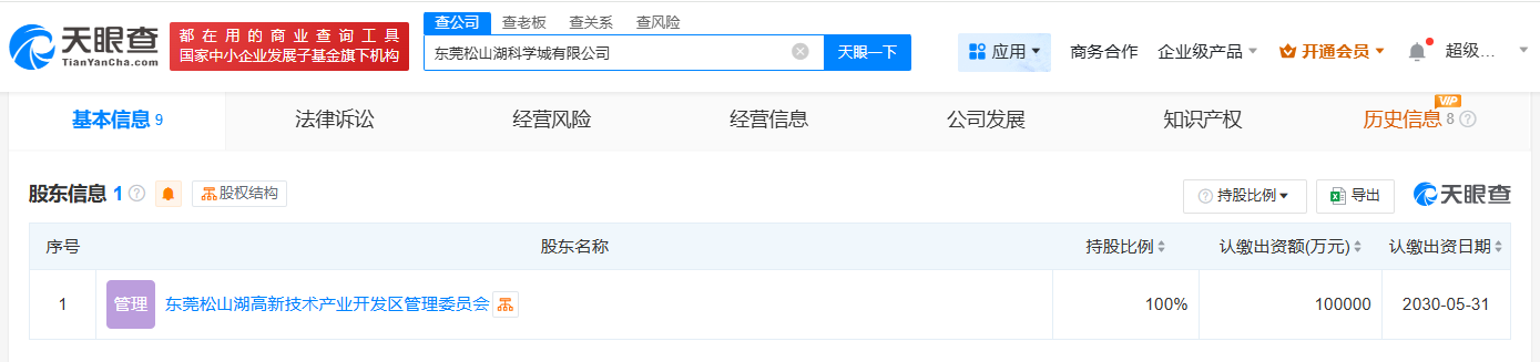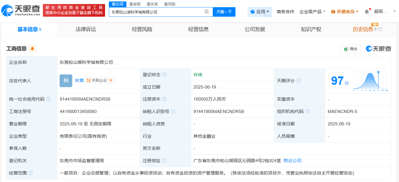 天眼查App显示,东莞松山湖科学城有限公司成立,法定代表人为林爽,注册资本10亿元,经营范围涵盖企业总部管理、投资活动及资产管理服务,由东莞松山湖高新技术产业开发区管理委员会全资持股。