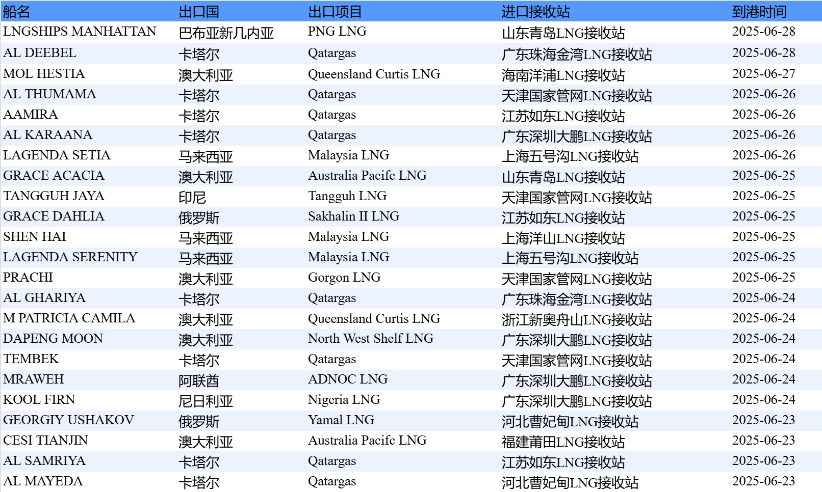 E-Gas系统LNG船期预测显示,6月23日-6月29日当周,中国预计将通过沿海LNG接收站进口LNG23船,进口量约176万吨,显示出中国LNG进口需求的持续增长。