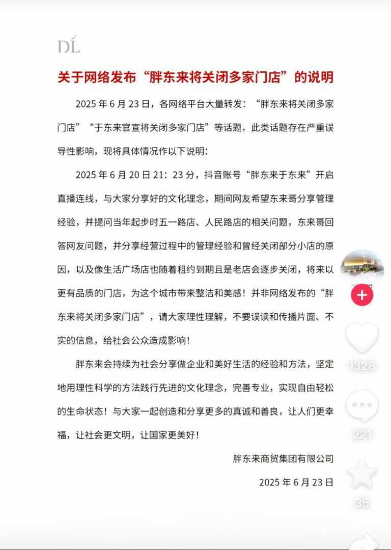胖东来回应称:“2025年6月20日21:23分,抖音账号”胖东来于东来“开启直播连线,与大家分享好的文化理念,期间网友希望东来哥分享管理经验,并提问当年起步时五一路店、人民路店的相关问题,东来哥回答网友问题,并分享经营过程中的管理经验和曾经关闭部分小店的原因,以及像生活广场店也随着租约到期且是老店会逐步关闭,将来以更有品质的门店,为这个城市带来整洁和美感!并非网络发布的‘胖东来将关闭多家门店’,请大家理性理解,不要误读和传播片面、不实的信息,给社会公众造成影响!”