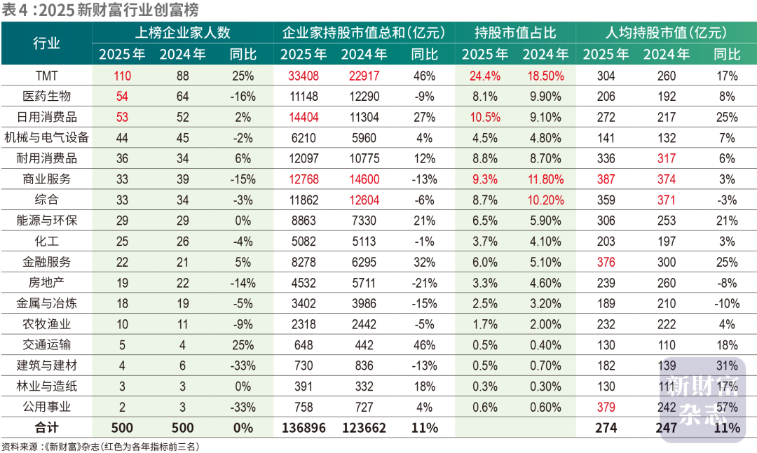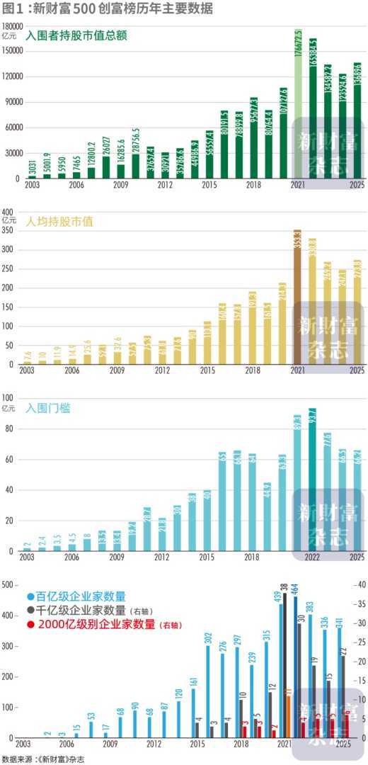 《2025新财富500富人榜》发布,上榜企业家总持股市值同比上涨11%,平均持股市值为273.8亿元,上榜门槛为66.2亿元,持股市值超百亿元的企业家有341位。