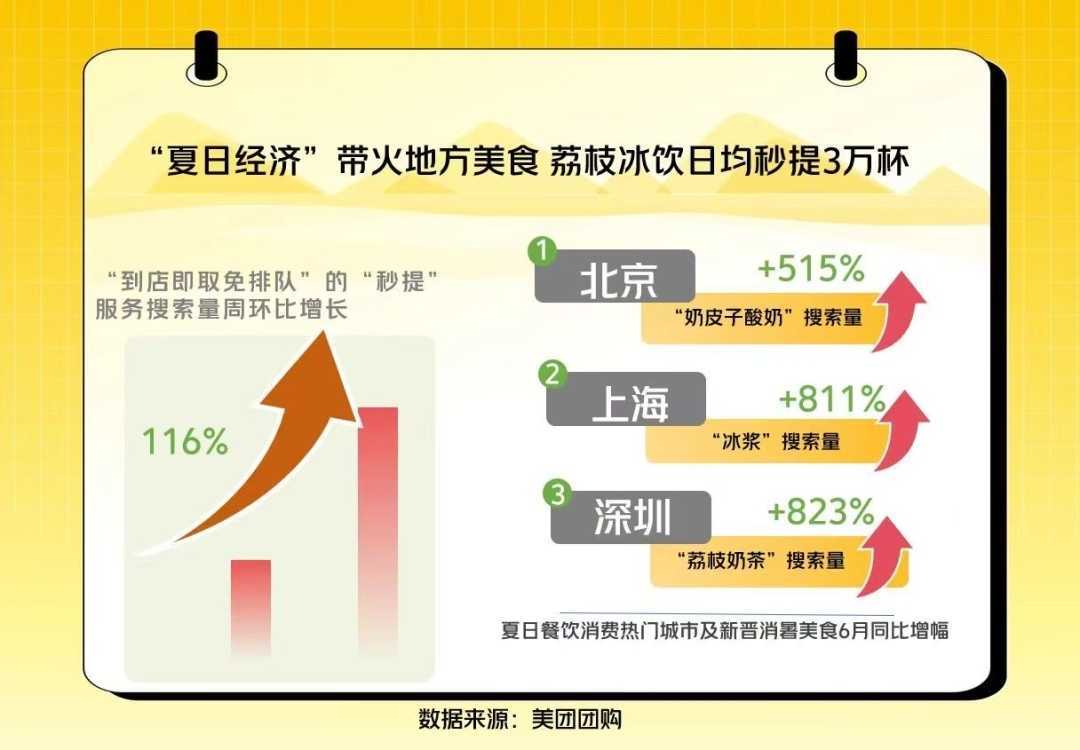 全国多地气温高升,冰品消费火热。美团团购数据显示,6月消暑美食搜索量激增,北京等成热门城市。线上秒提模式助力夏日经济增长,荔枝饮品等成新宠,冰品效应带动餐饮消费焕发新生。