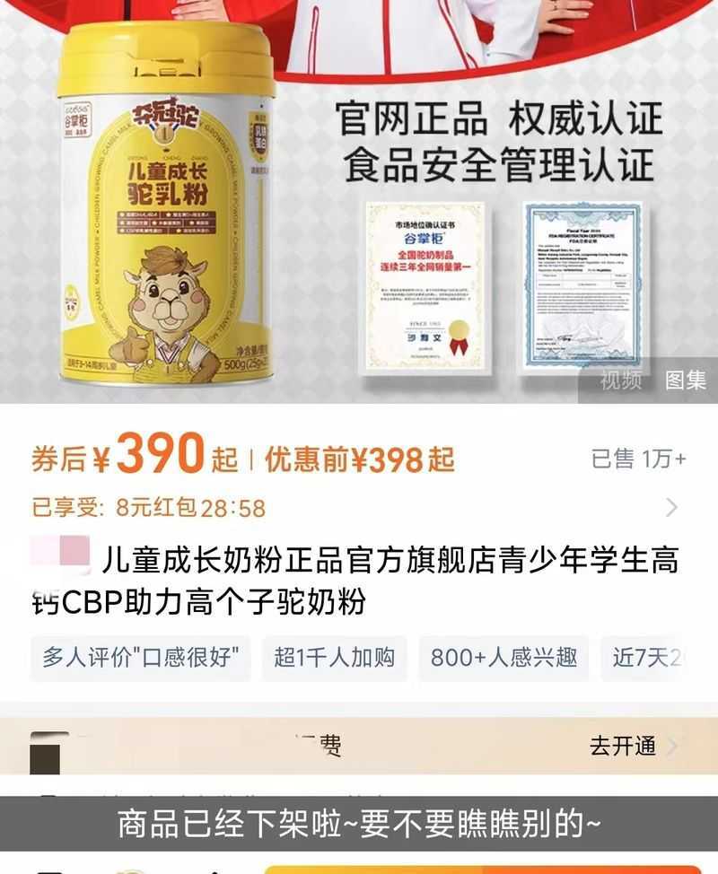 谷掌柜已将涉事“骆驼奶片”“儿童成长驼奶粉”下架。 电商平台截图