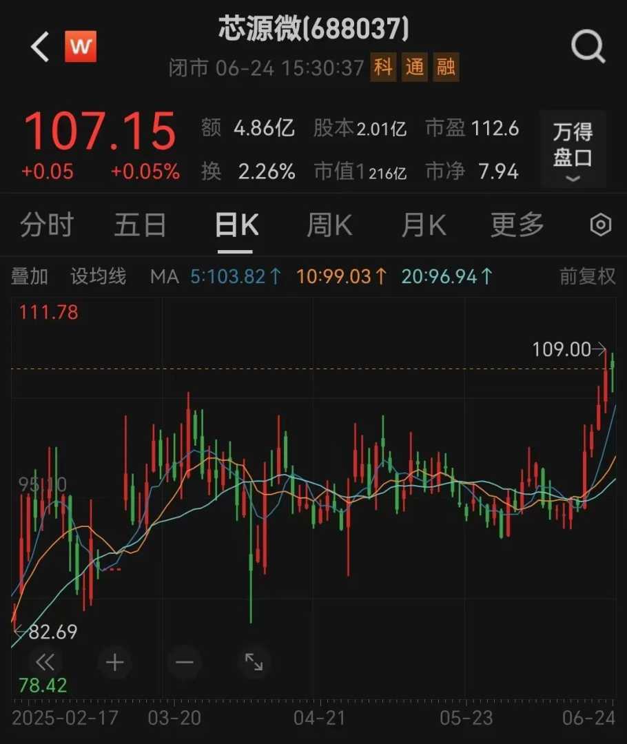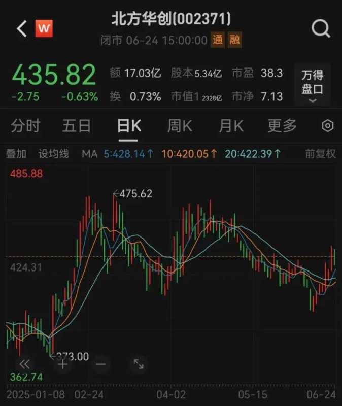 截至6月24日收盘,北方华创股价为435.82元/股,最新市值为2328亿元;芯源微股价为107.15元/股,最新市值为216亿元。