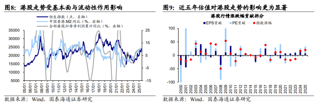 根据DDM模型,股票收益有两大来源,即盈利增速与估值波动。2020年以来估值对港股涨跌幅贡献增强,恰与港股A股联动性增强的时点吻合。过去港股流动性受海外因素影响大,但近年来关系削弱,外资占比持续下降,港股流动性对海外依赖逐步减弱。此外,中概股回流或削弱港股与美股的中期联动性。与此同时,内资加速流入使港股流动性与内地关联加深,港股开始更大程度反映内地资金行为逻辑和风险偏好,这或是近年港股与A股联动性增强的核心原因。
