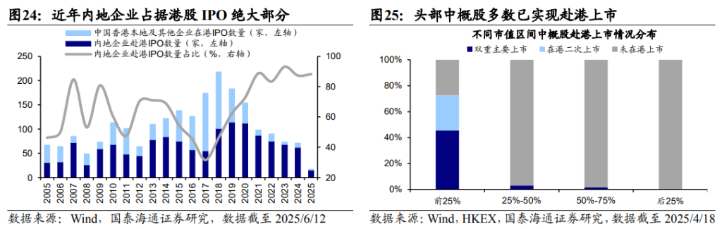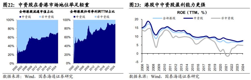 在第二部分中我们指出,自2020年以来,港股的微观资金结构发生了深刻变化,推动港股定价权逐步向内地资金倾斜。在本部分,我们将探讨港股定价的另一核心,即基本面,2020年以来港股基本面整体更加紧密联动于内地基本面。港股基本面与内地相关性一贯更强,当前港股上市企业中超三分之二为中资股,与内地基本面天然相关。随着A股企业赴港上市和中概股回归,港股内地企业占比或进一步上升。政策推动香港资本市场发展,两地联动有望进一步深化。