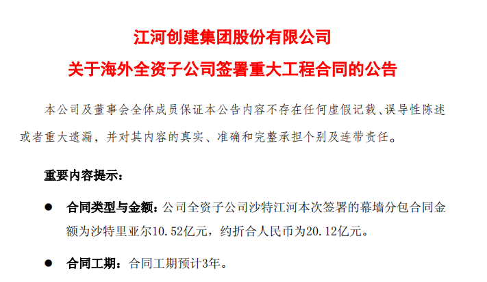 公告显示,上述幕墙合同金额为10.52亿沙特里亚尔(约合人民币20.12亿元),约占江河集团2024年度营业收入的8.98%;合同工期预计为3年。