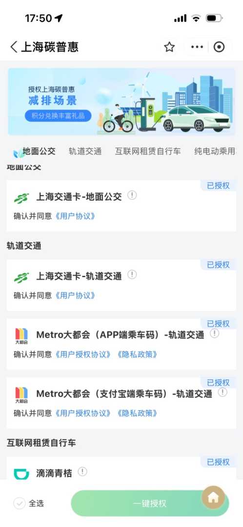 官方提供“薅羊毛”机会,在上海市生态环境局工作人员指导下,记者打开手机,在随申办搜索“碳普惠专区”,进入专区直接开通个人碳账户。然后,选择需要授权的减碳场景,比如地面公交、轨道交通等,由此正式开始减碳之旅。