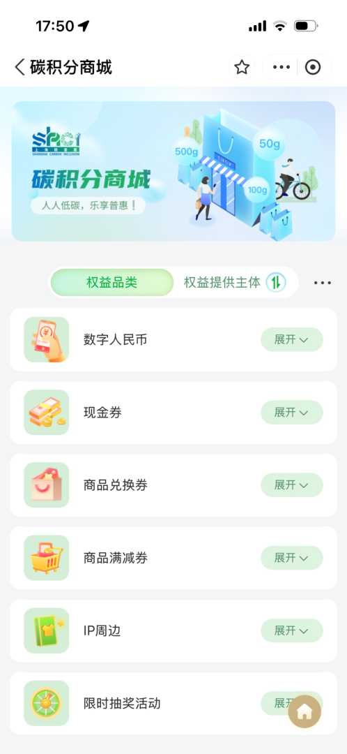 打开碳普惠专区的“碳积分商城”,可以看到有6种权益品类,包括数字人民币、现金券等。这些权益主要由支付宝、建设银行等主体提供。