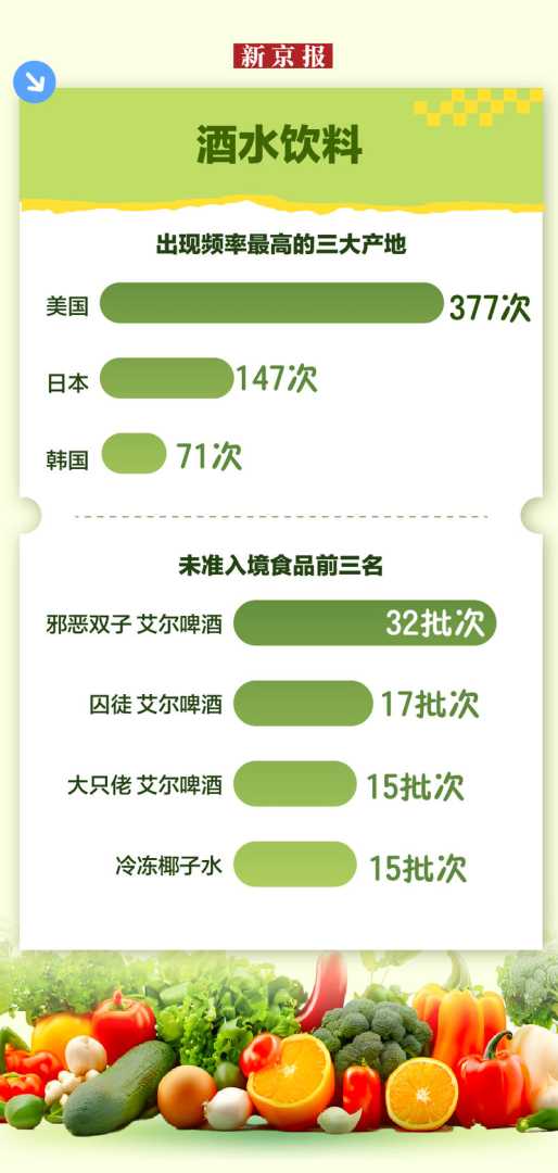 今年是“十四五”收官之年,新京报记者梳理发现,我国对输华食品准入管理更严格,未准入境食品信息批次明显增加。酒水饮料成为2024年未准入境最多的食品类别,啤酒、南美白对虾、牛肉等不合格现象较多,标签不合格、货证不符是主要原因。